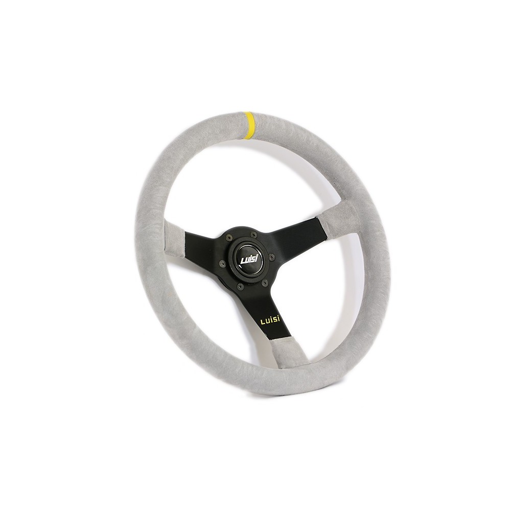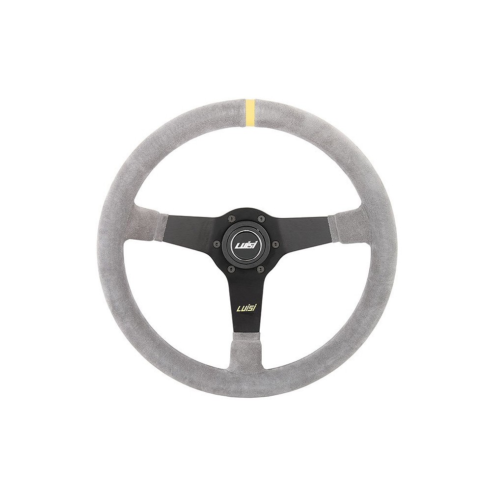 Marca: Luisi - Modello: Mirage Corsa - Diametro volante: 350mm / 13.8'' - Materiale: Camoscio. Altezza calice: 75mm. Note: con pulsante. ATTENZIONE: Si consiglia l'acquisto del relativo mozzo di marca Luisi specifico per auto.