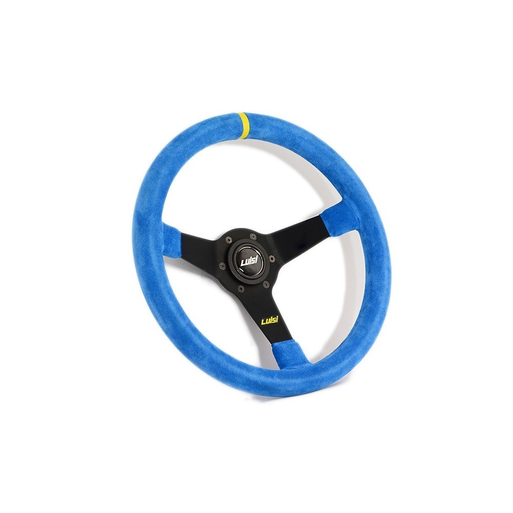 Marca: Luisi - Modello: Mirage Corsa - Diametro volante: 350mm / 13.8'' - Materiale: Camoscio. Altezza calice: 75mm. Note: con pulsante. ATTENZIONE: Si consiglia l'acquisto del relativo mozzo di marca Luisi specifico per auto.