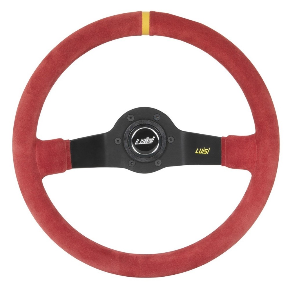 Marca: Luisi - Modello: Jet Corsa - Diametro volante: 350mm / 13.8'' - Materiale: Camoscio. Altezza calice: 95mm. Note: con pulsante. ATTENZIONE: Si consiglia l'acquisto del relativo mozzo di marca Luisi specifico per auto.
