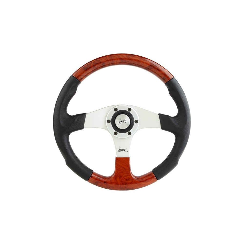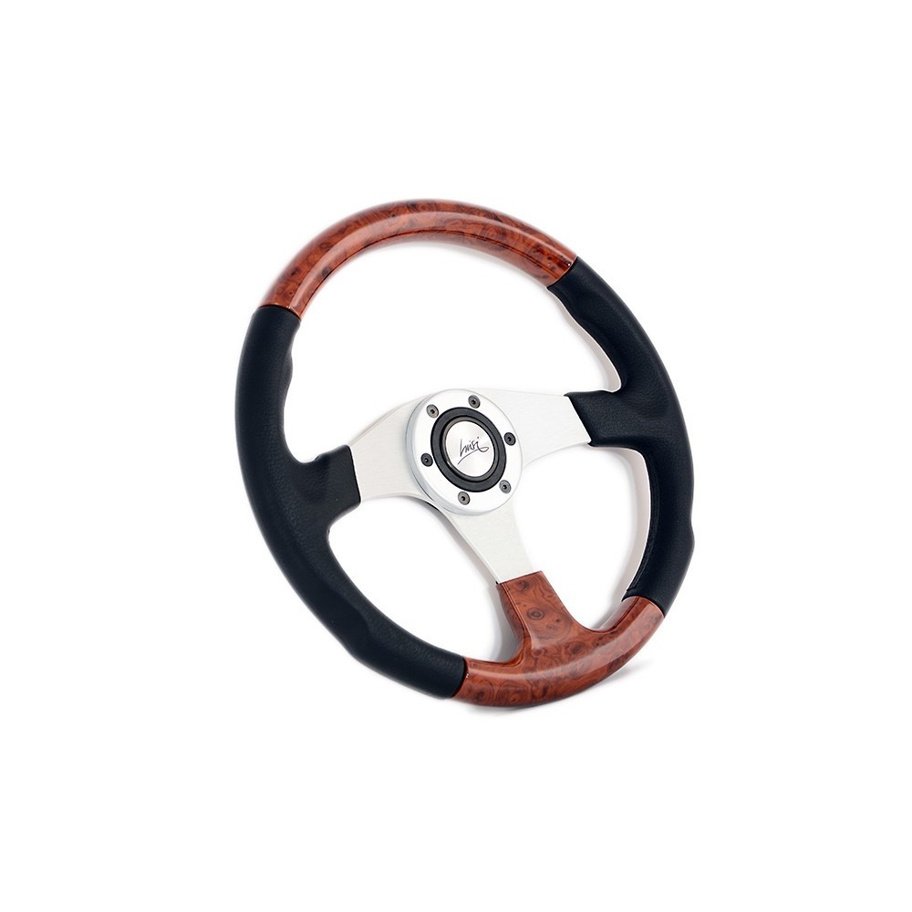 Marca: Luisi - Modello: Evolution 2B - Diametro volante: 360mm / 14.2'' - Materiale: Poliuretano. Altezza calice: 45mm. Note: con inserti cubicati radica look e pulsante. ATTENZIONE: Si consiglia l'acquisto del relativo mozzo di marca Luisi specifico per auto.